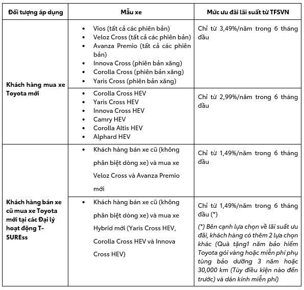 Lưu ý: Thông tin và điều kiện áp dụng chi tiết của chương trình ưu đãi lãi suất của TFSVN trong tháng 9.2025, Quý khách hàng vui lòng tham khảo thông báo từ TFSVN hoặc liên hệ các Đại lý Toyota trên toàn quốc để được tư vấn.