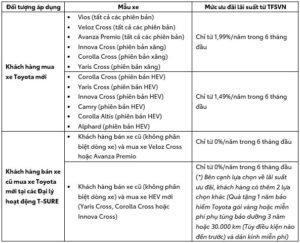 Lưu ý: Thông tin và điều kiện áp dụng chi tiết của chương trình ưu đãi lãi suất của TFSVN trong tháng 10/2025, Quý khách hàng vui lòng tham khảo thông báo từ TFSVN hoặc liên hệ các Đại lý Toyota trên toàn quốc để được tư vấn.